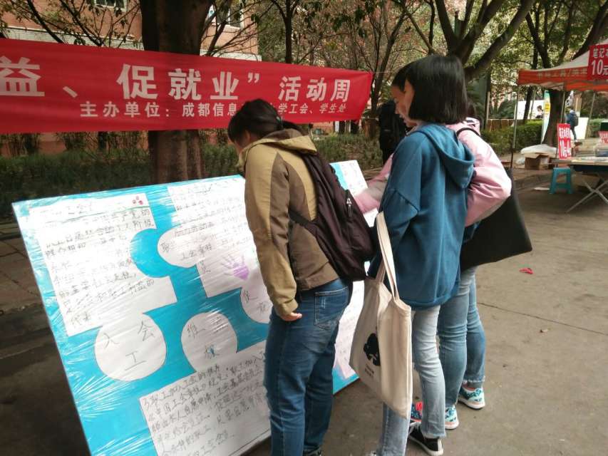 为使我校学子更深入了解工会知识,让应届大学毕业生更好地了解并适应社会生活和工作岗位,尽快实现由“学校人”向“社会人”的角色转变,校工会于11月7日开展“入工会、维权益、促就业”为主题的工会知识宣传活动周。本次活动以设点宣传及座谈会的形式面向全校老师和学子宣传工会知识。11月7日,校工会在一食堂设点宣传,通过分发《工会会员维权手册》、使用展板宣传讲解工会知识等行式,向我校同学广泛宣传《工会法》、《劳动合同法》、《中国工会章程》,让同学们了解工会的性质、任务、工会及会员的权利义务、维权途径方法等知识,帮助我校同学在未来的创业就业过程中增强维权意识,提高处理劳动关系问题的能力,尽快地适应社会。
